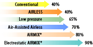 Users of AIRMIX achieve the highest transfer efficiency available. Efficiencies on different types of manual spray equipment are: